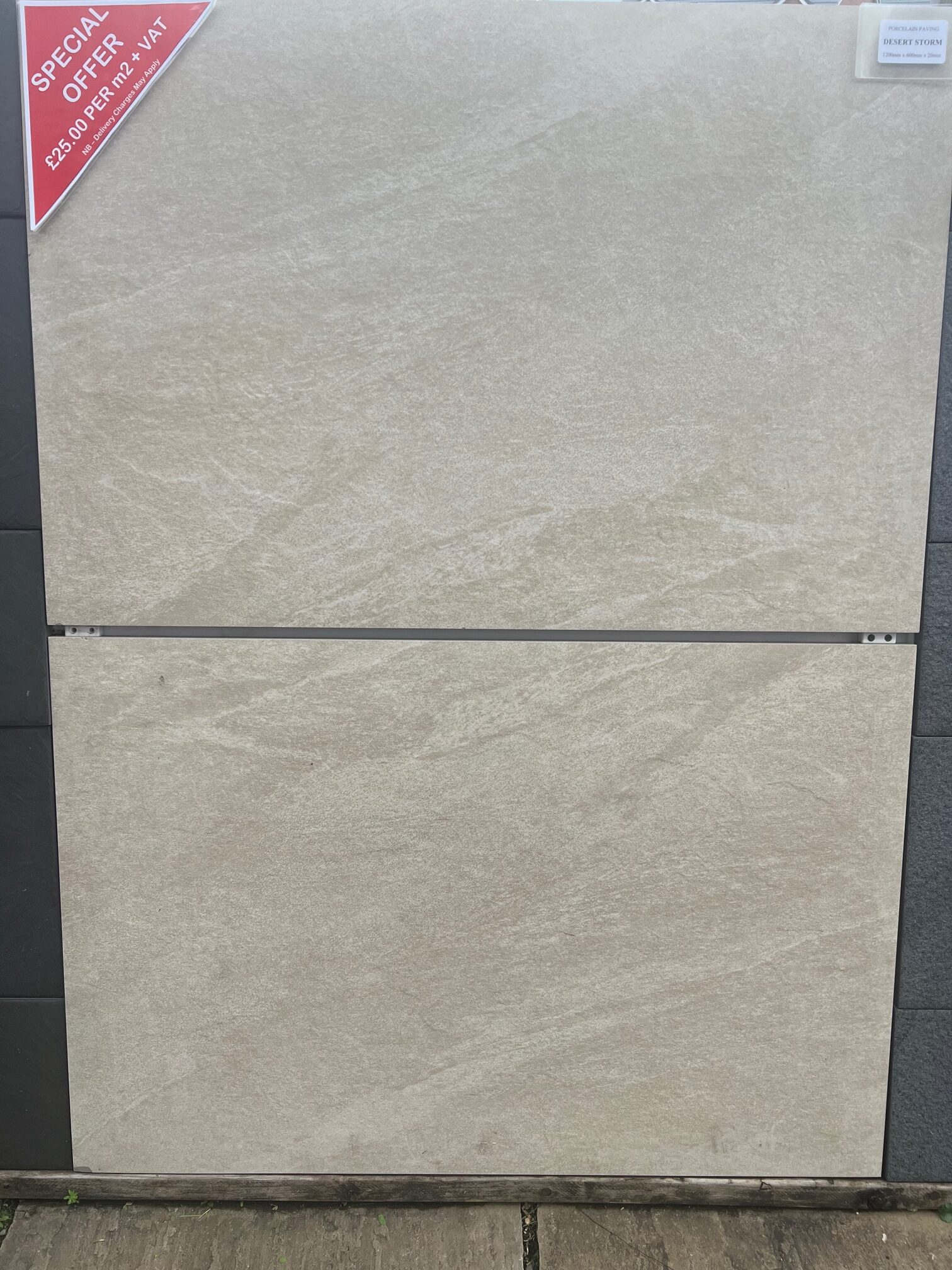 DESERT STORM porcelain paving is tough external grade paving suitable for every climate, even the UK’s changeable weather, because it is frost resistant. Not only that, it is resistant to salts, chemicals, algae, mould & moss. And, it is scratch resistant, anti-slip and fireproof.